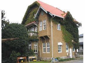 大正時代に日本人の設計によって建てられた赤い三角帰根の洋館。 かって周辺は黒松の林で、洋館もあちこちで見られたが、当時のままで残っているのはここだけ。 戦時中、空襲に遭いながらも、近所の人たちとの消火活動で焼失の難を逃れたが、2階の 壁には不発弾の落ちた跡が今も生々しく残る。